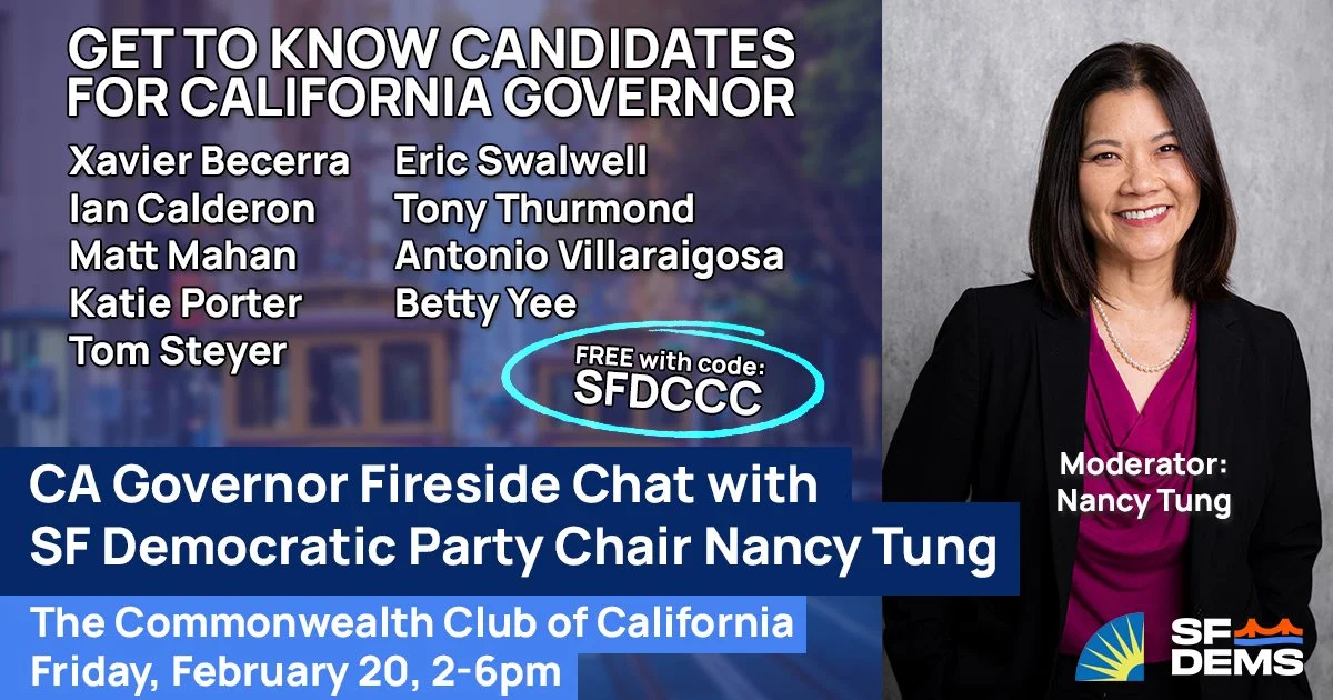 Don’t know who you’ll support for California’s Governor? It’s a crowded field and here’s your chance to get to know them in a more casual setting. They’ll each be interviewed by San Francisco Democratic Party Chair Nancy Tung on why they deserve your vote!