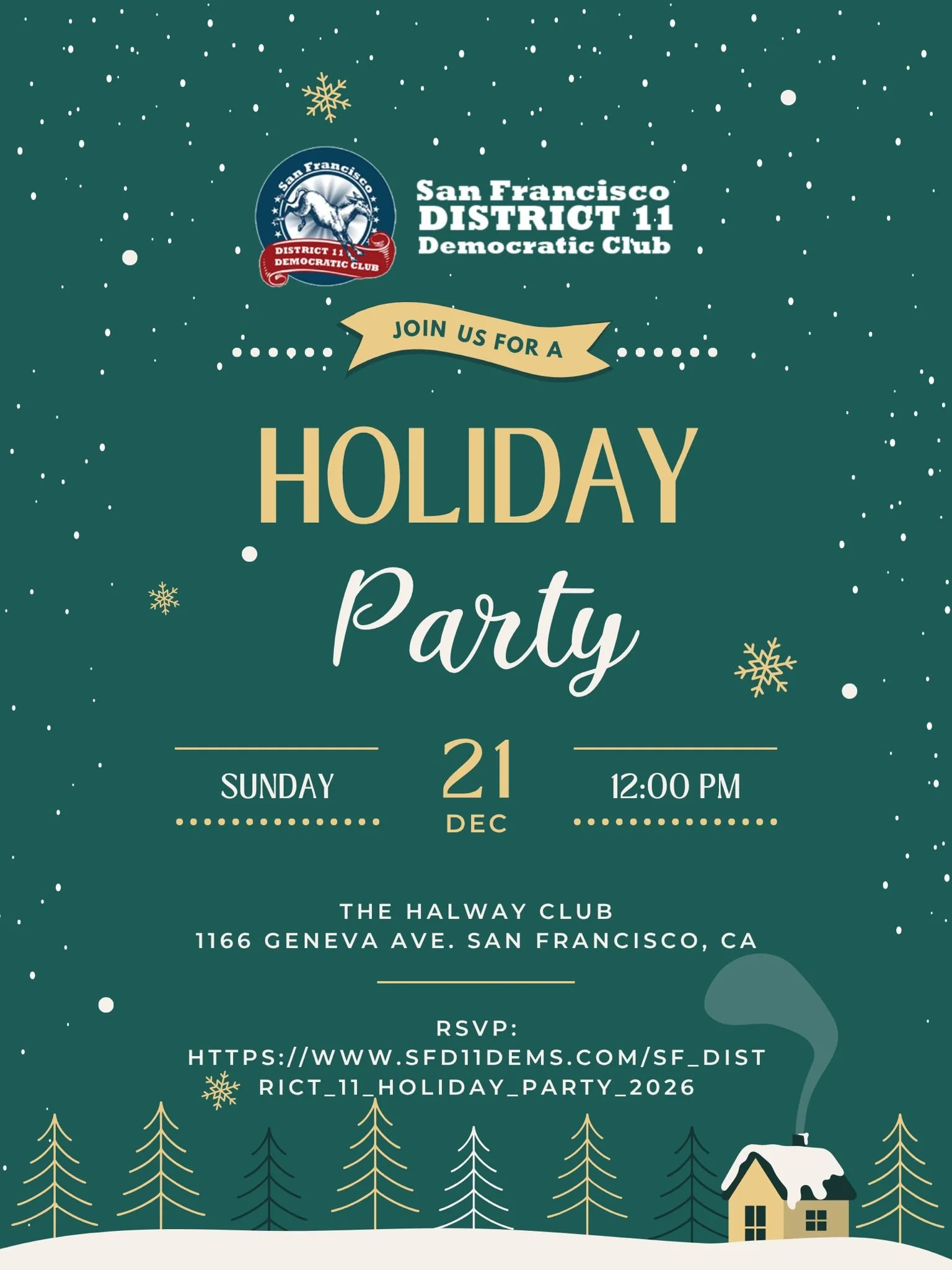 Join us on Sunday, December 21st at 12 pm to 4 pm for our annual Holiday Party at The Halfway Park 1166 Geneva Ave. San Francisco, CA.