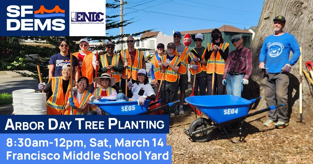 Join the SF Democratic Party and SF Public Works to green our city! Help us plant 100+ trees in one day across District 3 neighborhoods including Lower Nob Hill, Nob Hill, and more. This is a fantastic opportunity to give back to our community, meet fellow Democrats, and make a lasting environmental impact in San Francisco.
