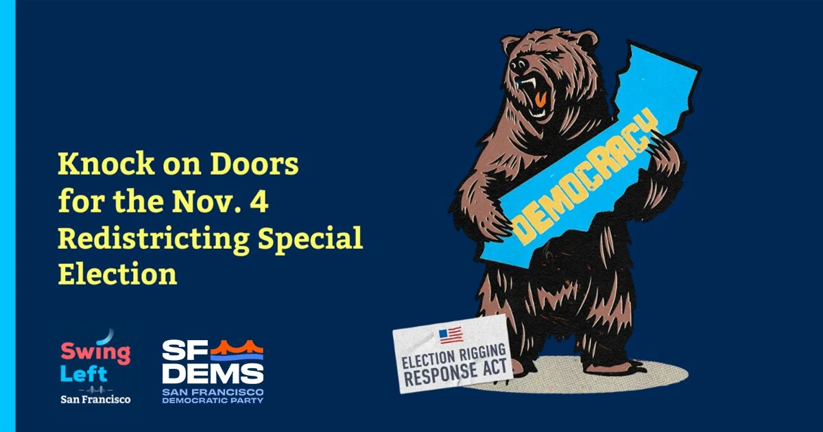 Join Swing Left San Francisco & the San Francisco Democratic Party to knock on doors every weekend until Election Day! You'll be notified of the exact meeting location before each canvass.
